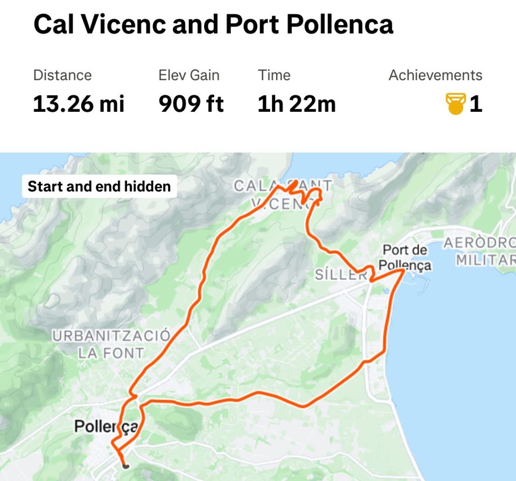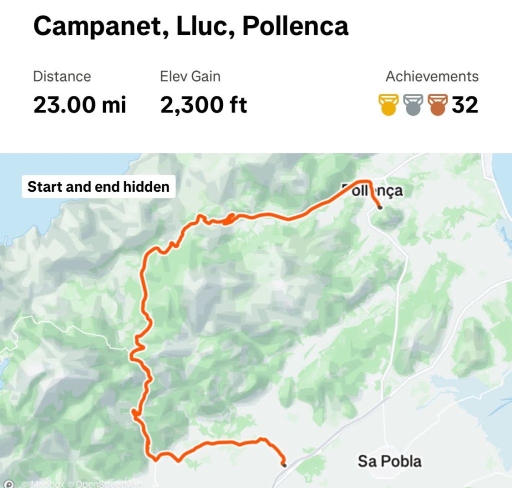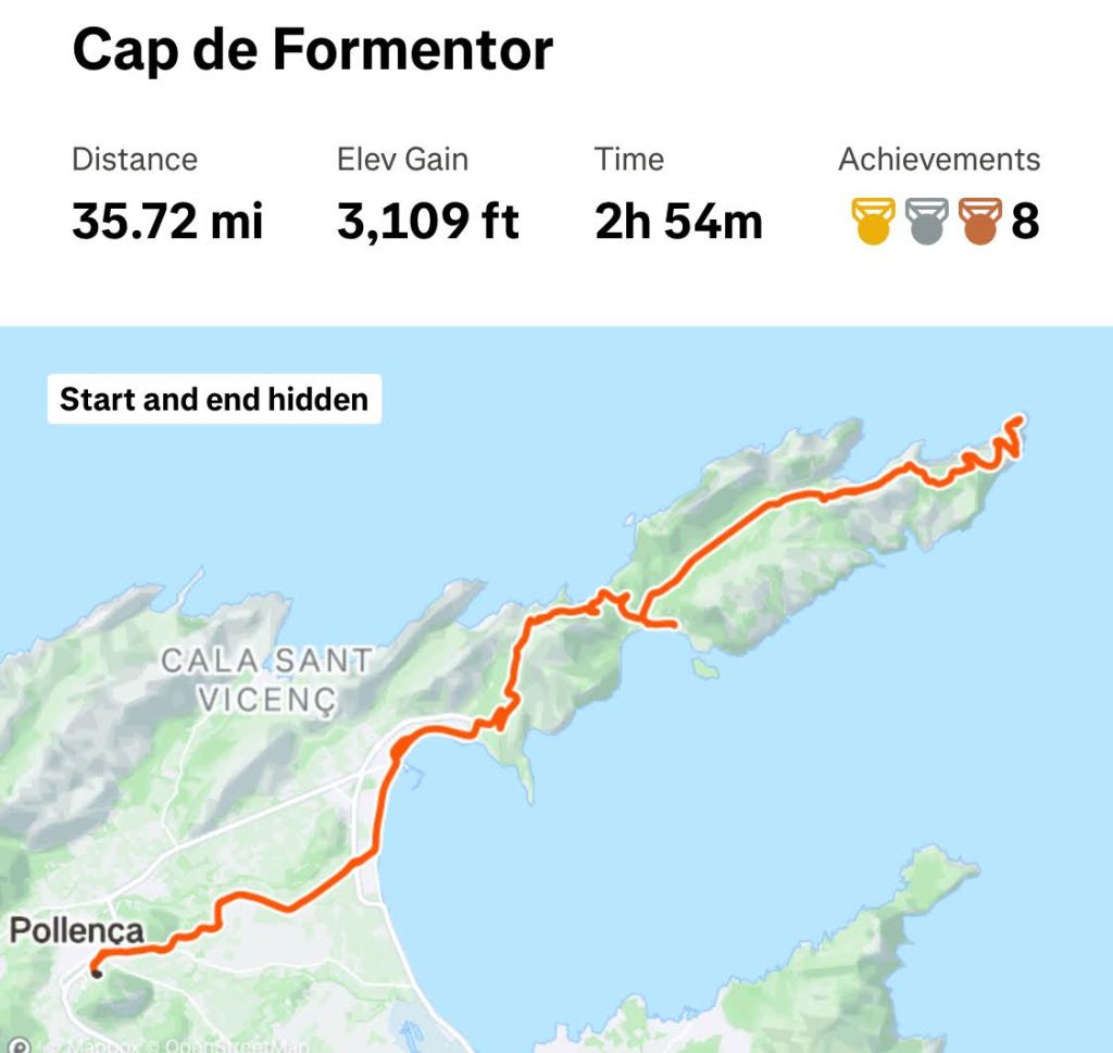 Meanwhile Sally came back from the horse riding to say they had bailed due to heavy rain (I had no rain in the mountains!) which had then stopped as she drove home. Feeling pretty grumpy she decided to ride out to Puerta Pollensa and then maybe a bit of the peninsular Formentor. While I got on with work, I kept track of her on live location. Saw her get to the bay on the south, leeward, side which was the obvious place to turn back from having done a big climb over to get there. Instead I saw her continue over the rest of the climbs all the way to the lighthouse at the end. The northern, windward, side apparently had waves crashing up huge cliffs. I was quite jealous. I did find an opportunity to do the same route myself a few days later.