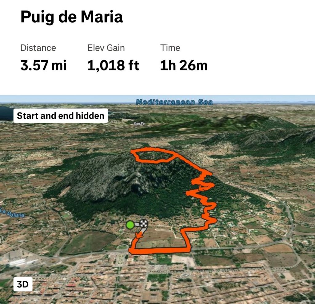 Tuesday 14th January: Sally dropped me off at Campanet while she went horse riding. I love the climb up to Lluc. Steady gradient but ever changing terrain of valley, gorges, steep hillside, and mountain ridges. Then pretty much all downhill to Pollensa in time for my team meeting and the start of my day working from “home”.
