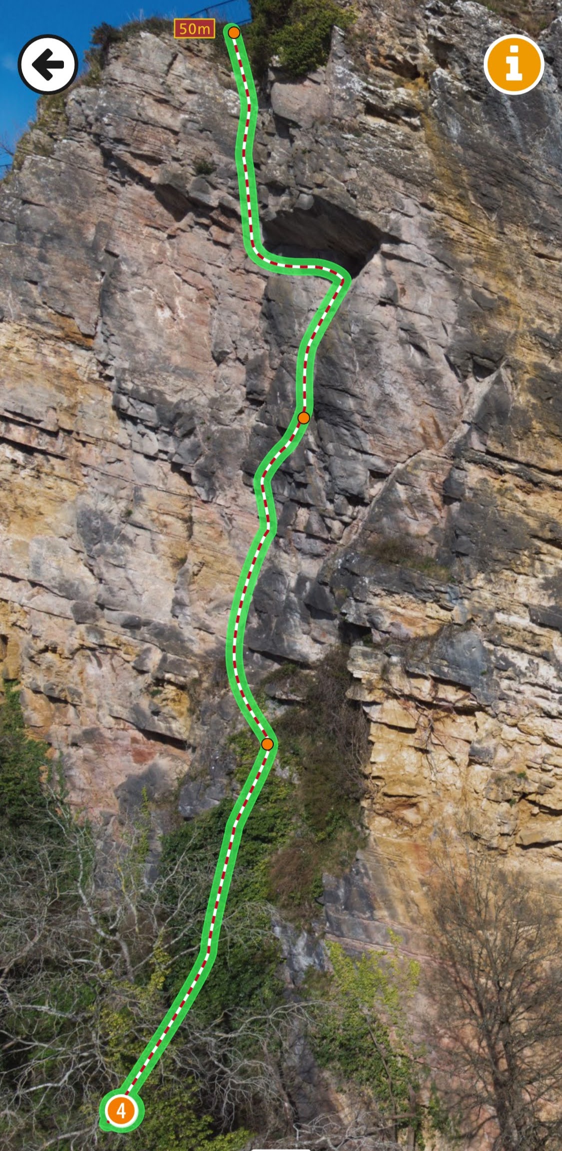 Traversing under the roof at the top felt very exciting on small slopy holds with no clarity that you were going to reach easier ground. I found it quite intimidating. The protection was pegs at the back of the roof. Not bad for the leader, but the second has the disconcerting experience of unclipping the gear just before the hard move, making a big swing on the rope if you come off a certainty.